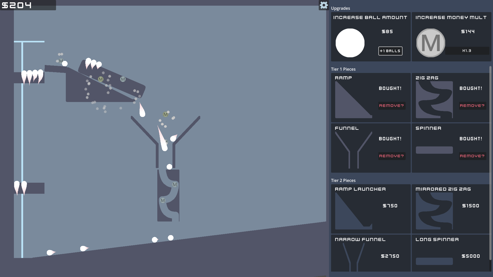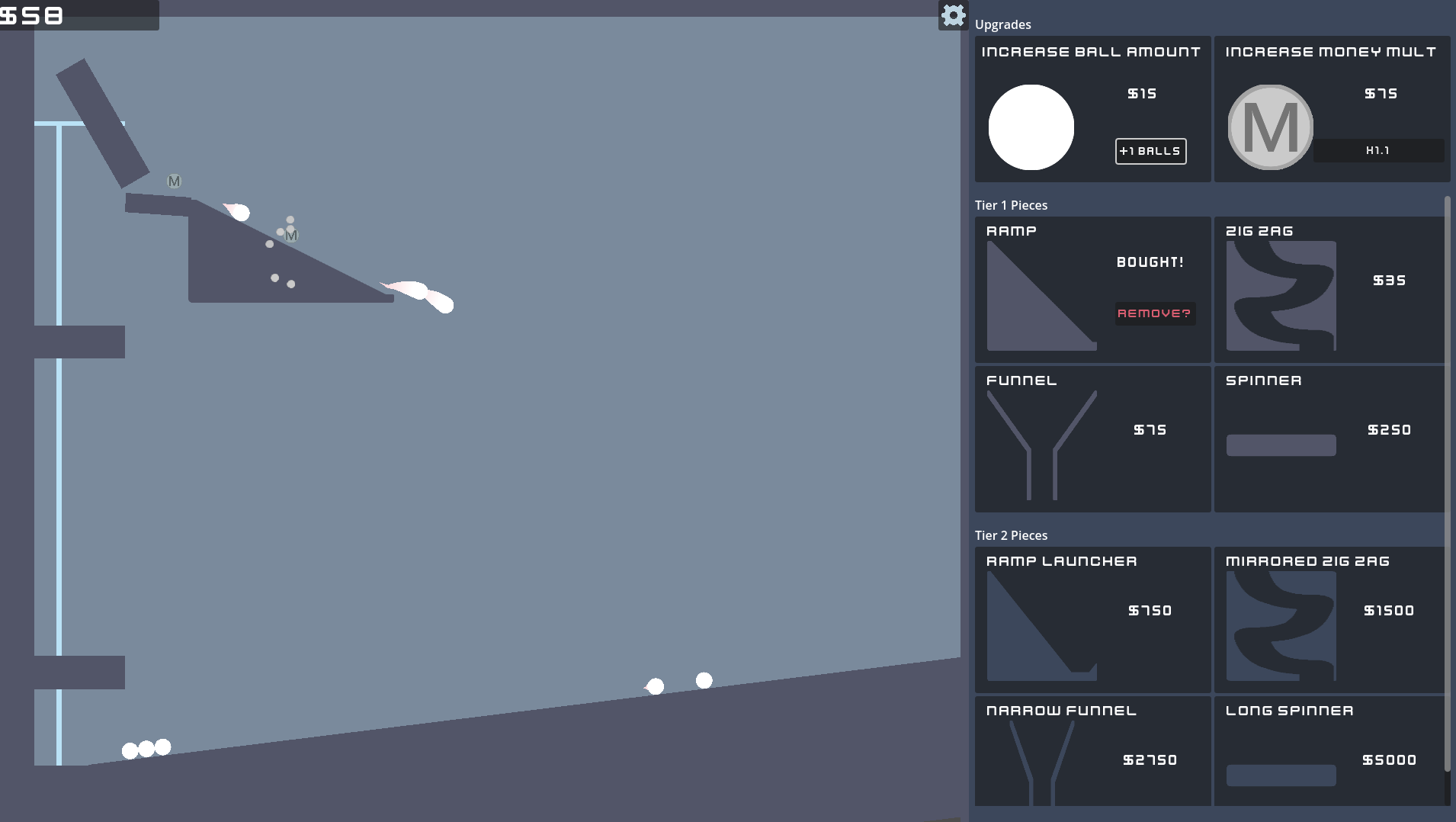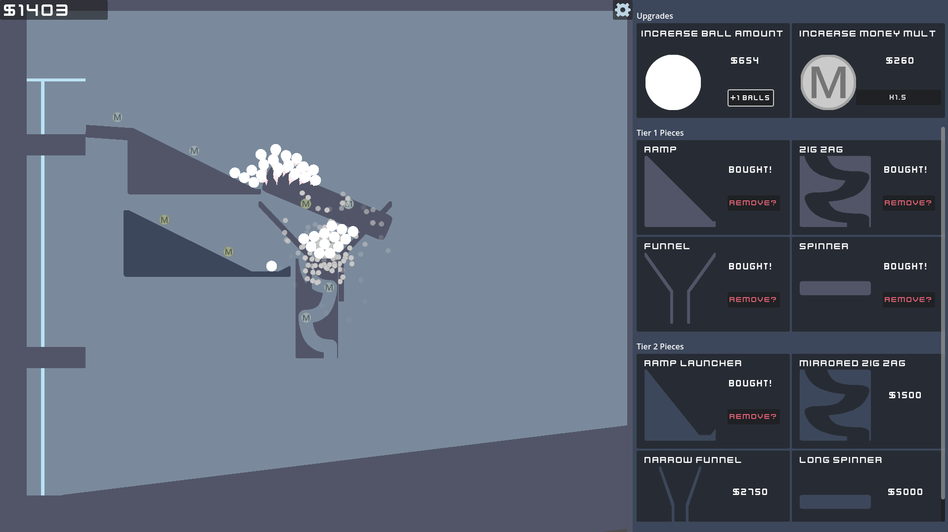 This is a great idea. Really like the concept. I just wish the physics allowed me to arrange pieces so that I could build up speed to get a larger launch off the ramp. There aren't really anyways to get your marbles to go up during the cycle so it was impossible to use all the pieces and felt like there was only one or two arrangements that worked. I'd love to see the game refined and expanded.